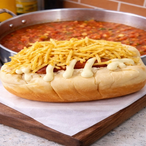 pão, molho caseiro de tomate, salsicha, carne picadinha ,requeijão milho, batata palha, queijo ralado e maionese casei... Ver completo
